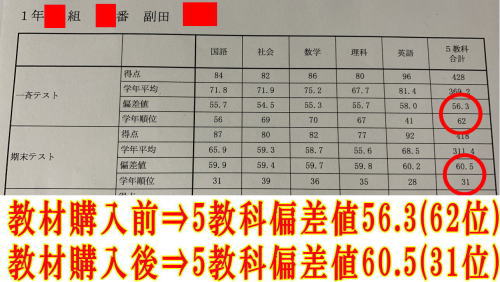 副田さんのお子さんは、もともと5教科の偏差値が56.3で、学年順位は62位でした。