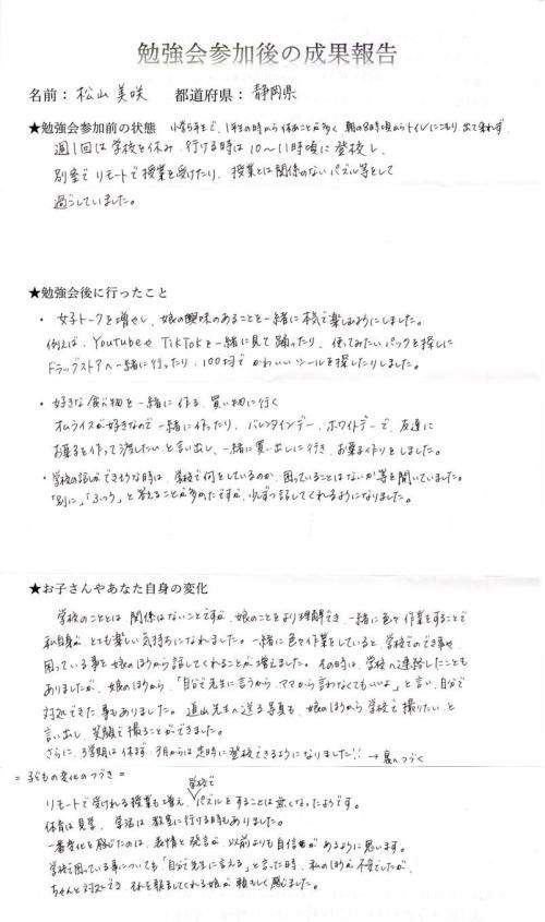 勉強会でお伝えした方法を実践したところ、3学期からは休まず登校できるようになったそうです。